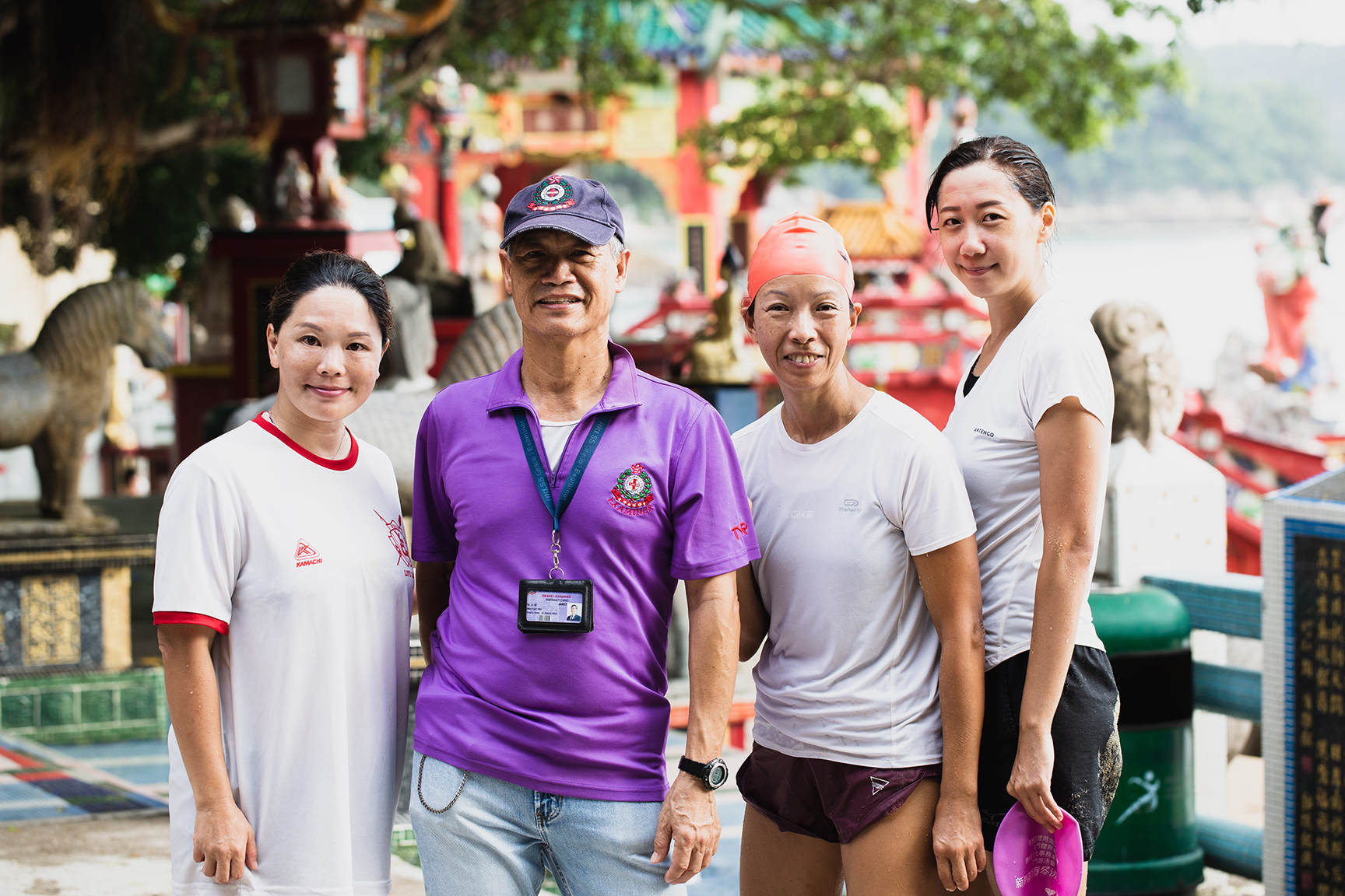 Caption: Hong Kong Life Saving Society examiner Mui Yet You (second from left) with lifesaver trainees (from left to right) Choi Ka Kei, Kowk Po Kuen and Ko Sin Mei. ©WHO/U. Chan