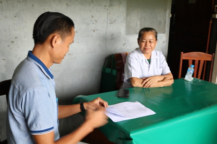 Next, the WHO and NCLE team joined Mrs Lounmy to meet Mrs Sisod Oudomsack at the village head office. The close collaboration with community leaders, such as by engaging unit leaders from schools, temples and factories, has made it easier for health workers to gather timely health information from those communities.