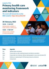WHO and UNICEF are jointly releasing the landmark Primary health care monitoring framework and indicators monitoring health systems through a primary health care lens, the first-ever globally normative and endorsed primary health care measurement and monitoring framework, and the official measurement framework in support of the Declaration of Astana and Operational Framework for PHC. As countries strive to reorient their health systems around the principles of primary health care, this Framework responds to Member States’ request to monitor primary health care performance to accelerate progress towards universal health coverage and the other health-related Sustainable Development Goals.