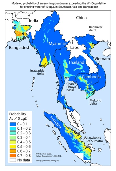 Human exposure to elevated levels of inorganic arsenic occurs mainly through the consumption of groundwater containing naturally high levels of inorganic arsenic (as found in a number of countries), food prepared with this water, and food crops irrigated with high-arsenic water sources. In one estimate, nearly 43 000 deaths annually in Bangladesh alone were attributed to chronic arsenic exposure.