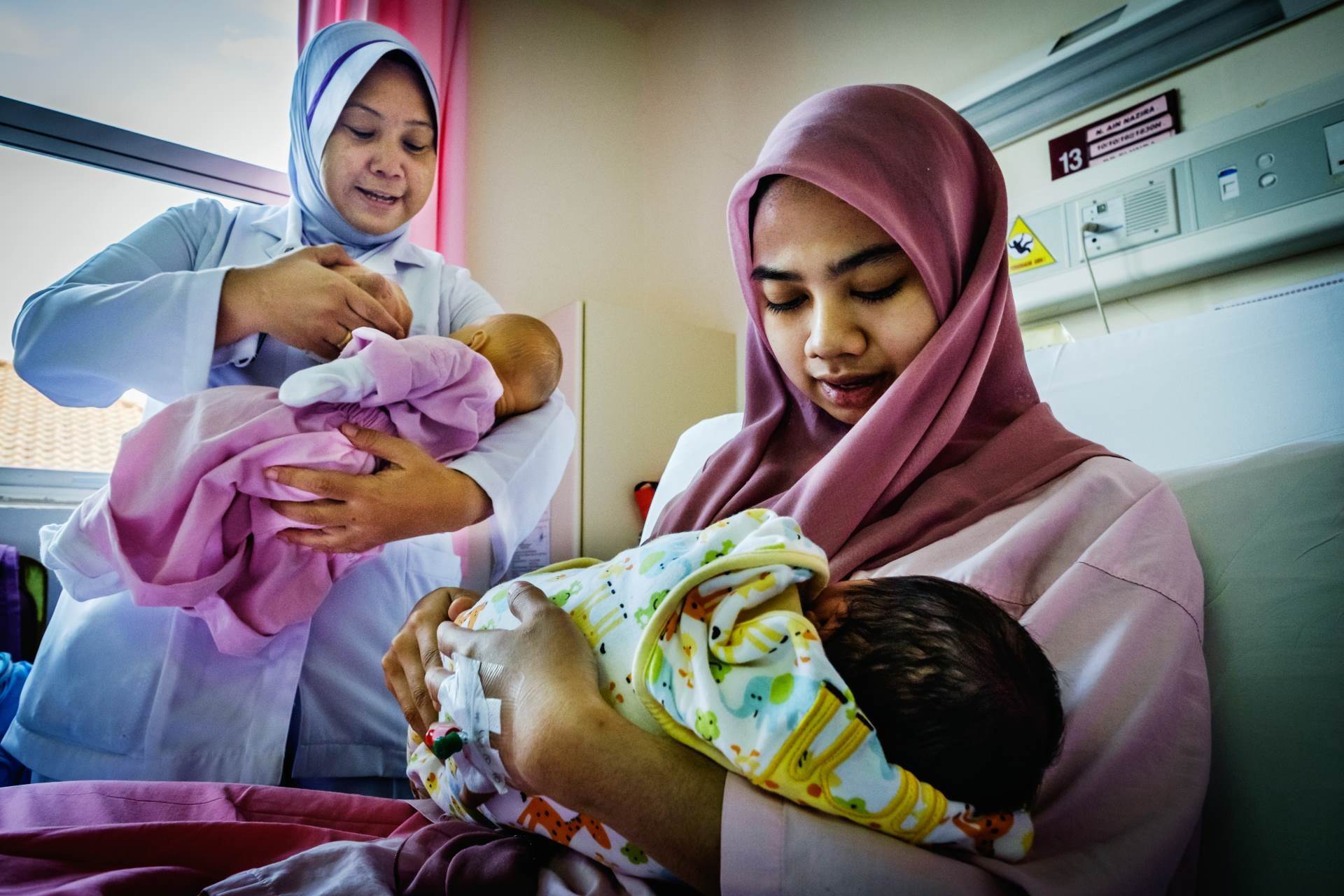 A nurse is counselling mother on appropriate breastfeeding for newborns, at Health Clinic Precinct in Malaysia.